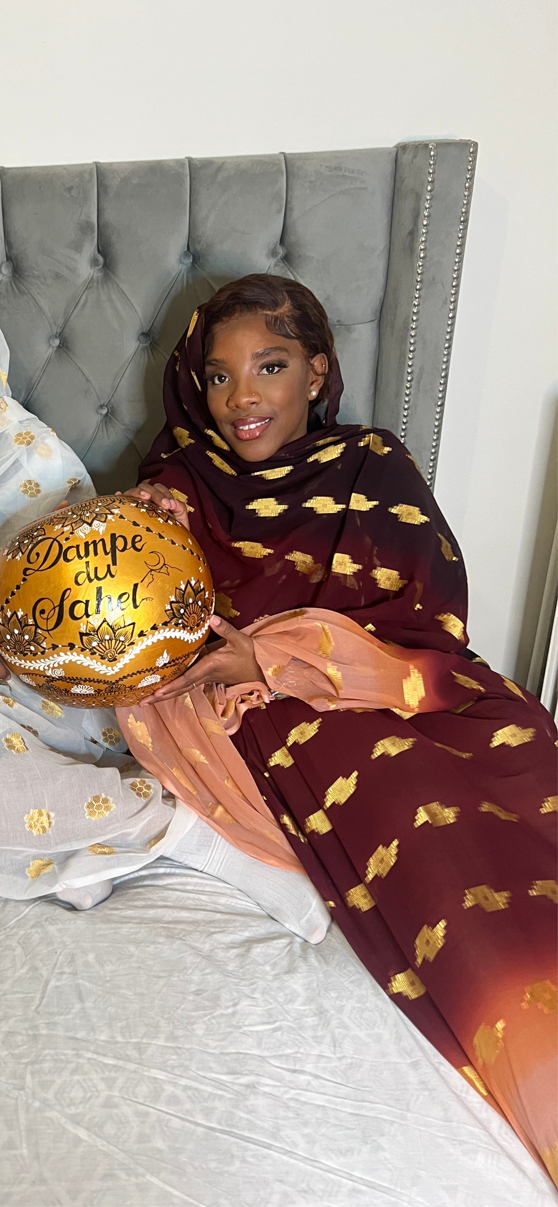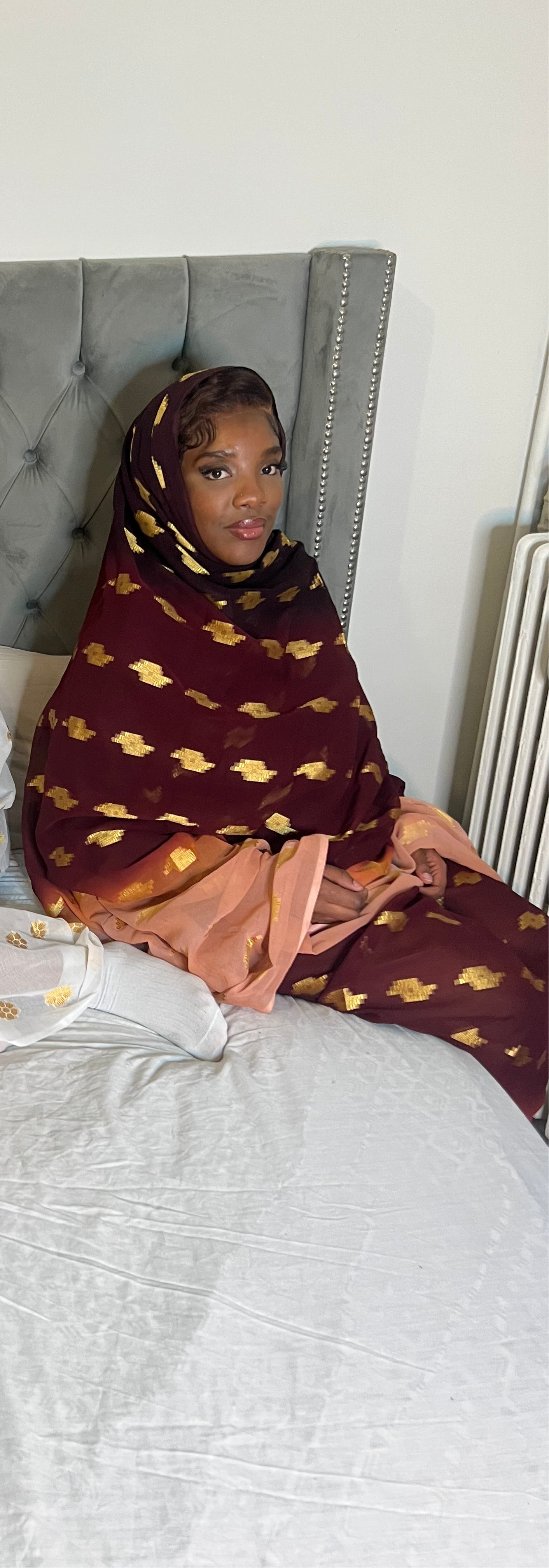 Ce magnifique dampé en mousseline rigide transparente séduit par son dégradé subtil du rose clair au bordeaux profond, rehaussé de motifs dorés tissés qui captent la lumière avec élégance.